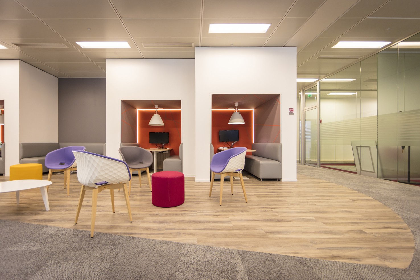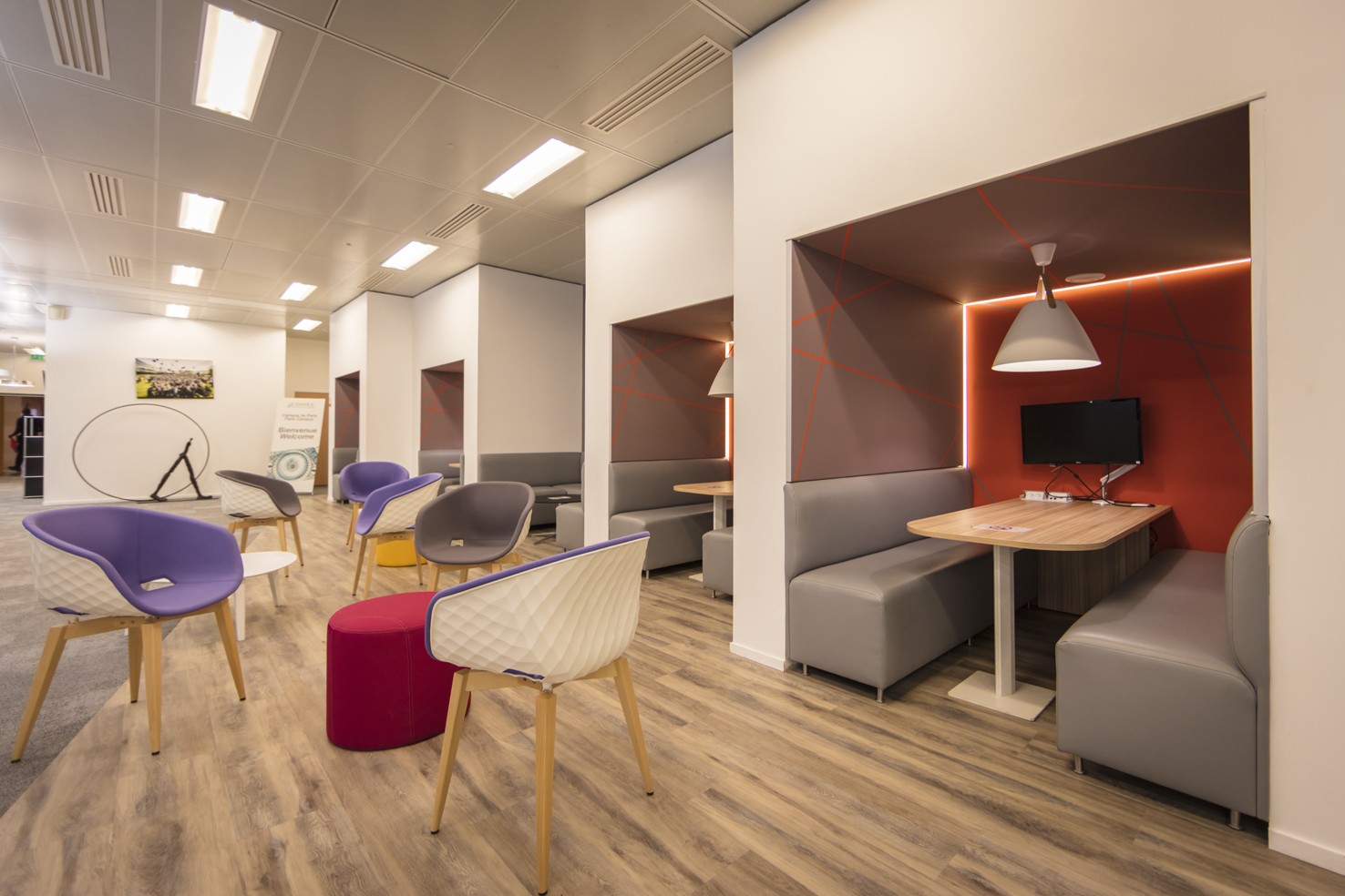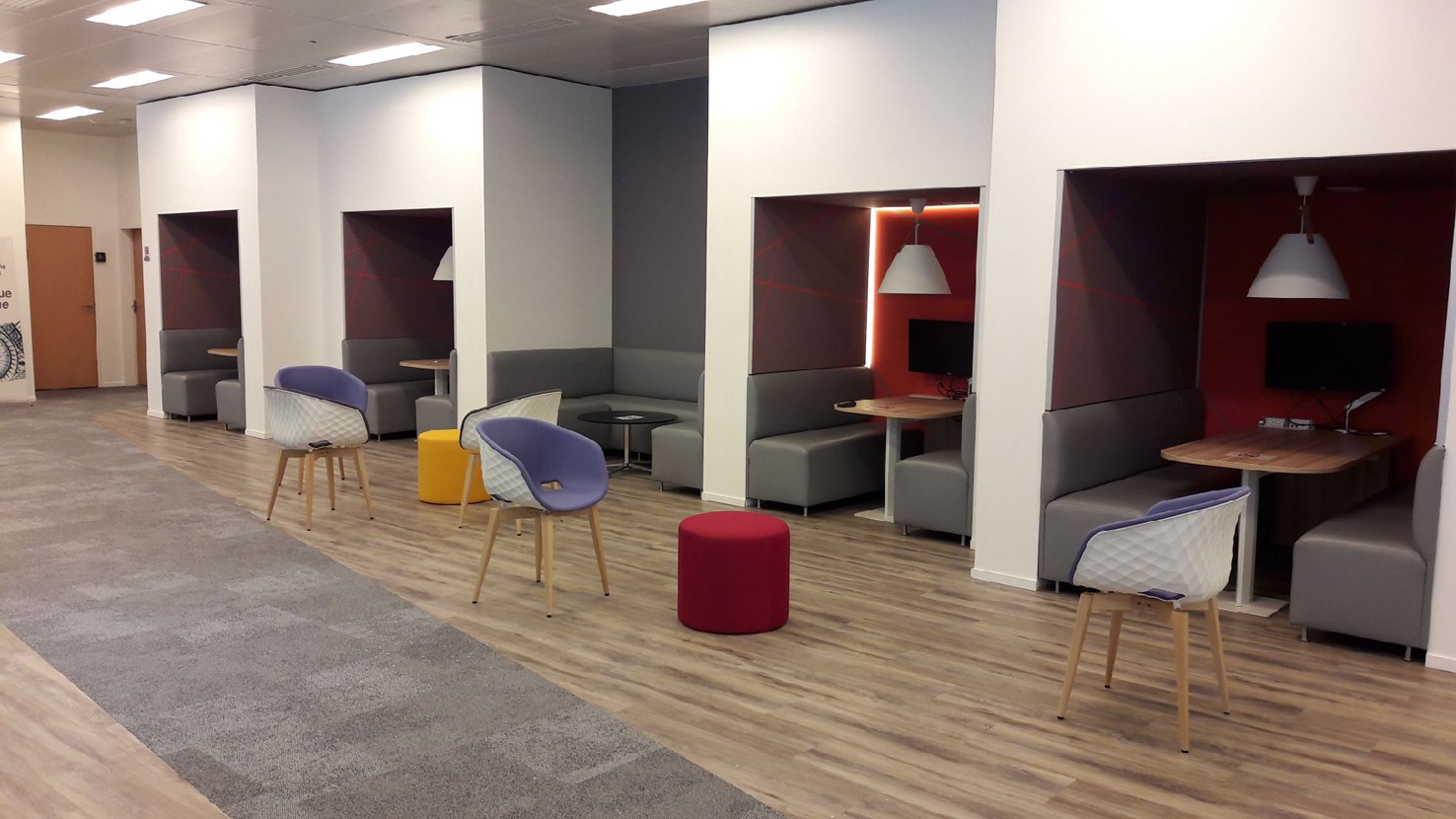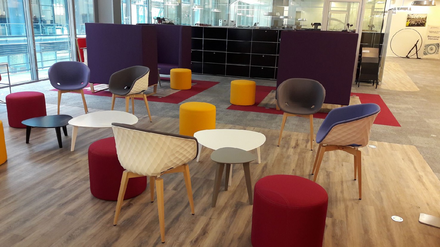 Entre 2017 et 2018, nous avons conçu et aménagé des espaces de détente et de bureaux, en créant des zones lounge conviviales et fonctionnelles. Les espaces sont équipés de poufs et canapés FAMO, de fauteuils UNIKA de la marque ET AL, de tables de réunion FAMO et d’assises MIDJ. Le projet comprend également l’installation d’une banque d’accueil MDD ainsi qu’une cuisine ARAN, contribuant à offrir un environnement à la fois accueillant, moderne et adapté aux usages des étudiants et du personnel.