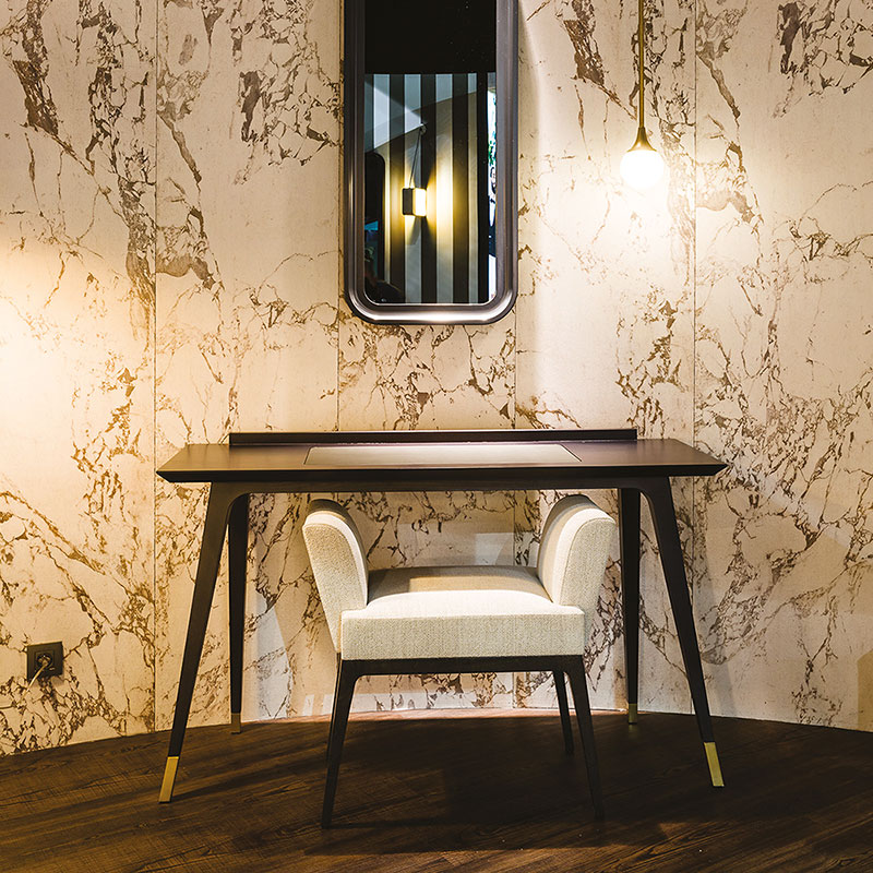 Bureau • Structure hêtre massif • Plateau hêtre de fil avec sous main incrusté en simili cuir (en option) • Sabots dorés ou inox • Autres finitions possibles • Possibilité dimensions sur-mesure