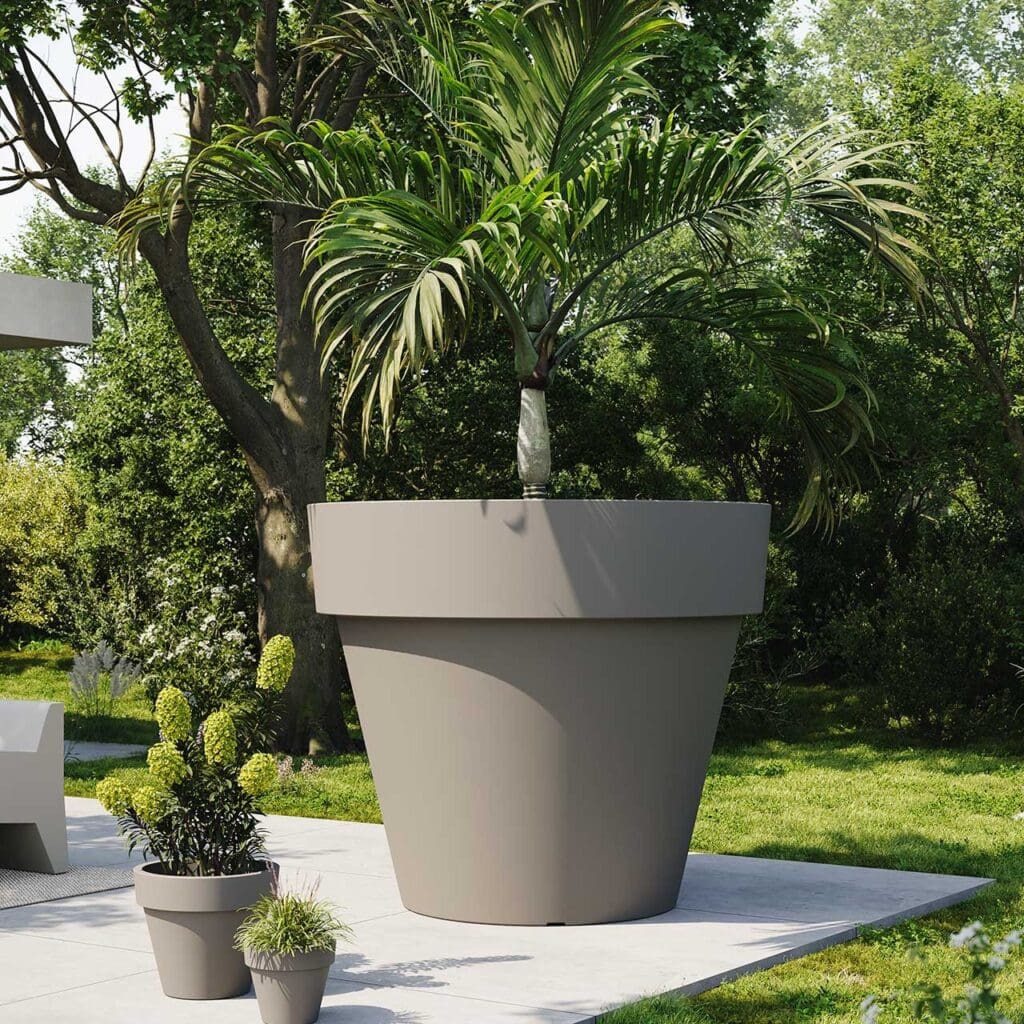 Pot en résine de polyéthylène rotomoulé. 100 % recyclable. Convient pour un usage intérieur et extérieur. Disponible en différentes finitions.
