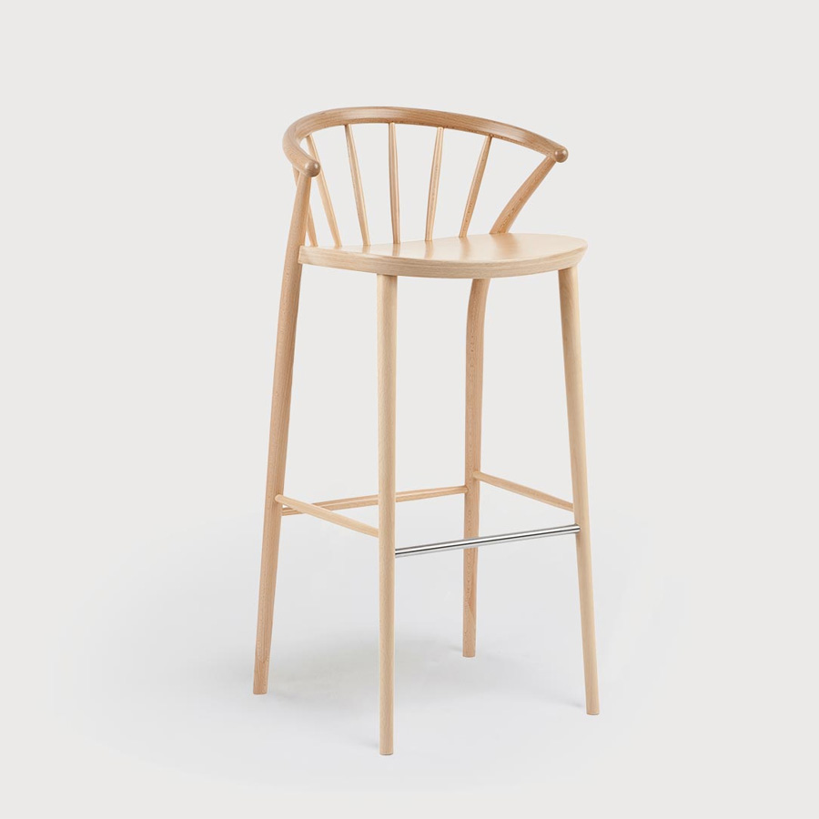 Ce tabouret se distingue par sa structure combinant des pièces courbées et tournées, ainsi qu’une assise en contreplaqué profilé. Le design est également unique grâce aux pieds arrière qui surplombent l’assise et se fondent harmonieusement dans la structure supérieure du dossier.